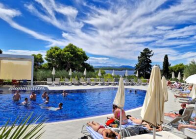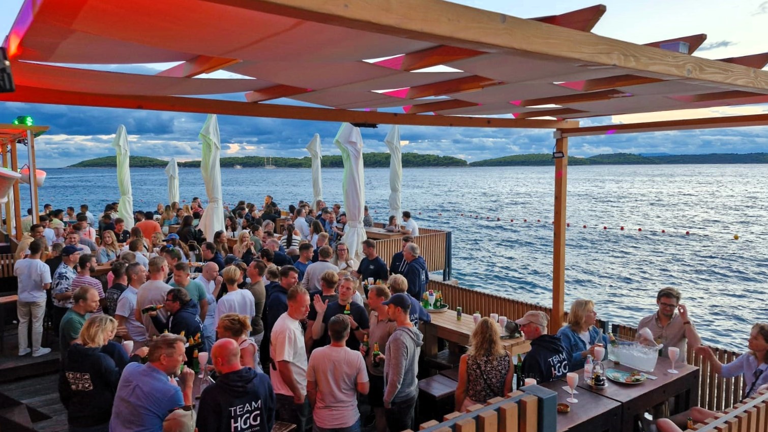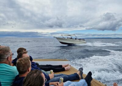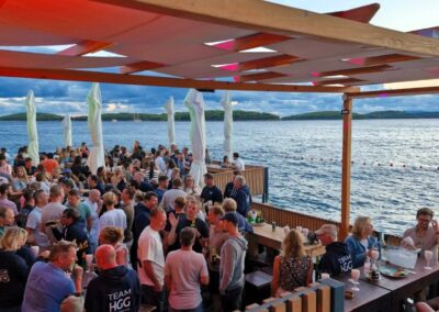 Bij aankomst op de luchthaven van Split gaan de koffers in een busje, en wandelen we in slechts 10 minuten naar de speedboten. Met een drankje in de hand en muziek op de achtergrond, varen we de Adriatische Zee op en begint het genieten voor de HGG’ers. Al snel bereiken we de eerste bestemming van deze reis: de schitterende Paklinski-eilanden. In een helderblauwe baai, op een terras onder de palmbomen, genieten de collega’s van een heerlijke (late) lunch met lokale gerechten van de Dalmatische grill.